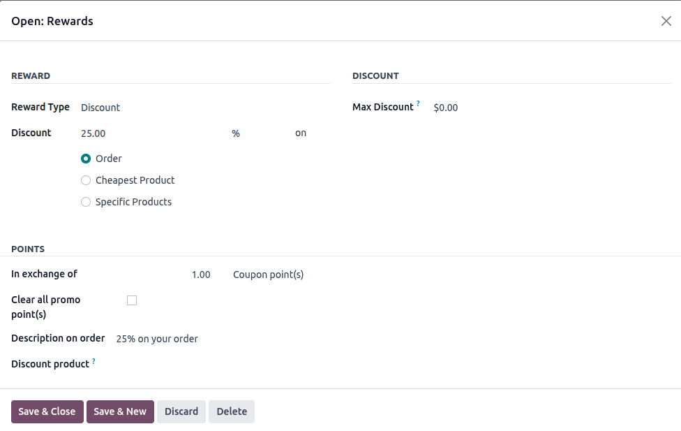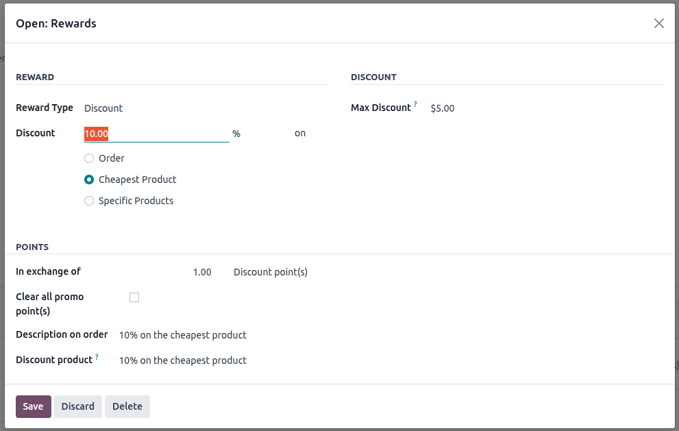 On the reward, we'll set the Discount amount, Max Discount with the discount being set on the cheapest product on the order.