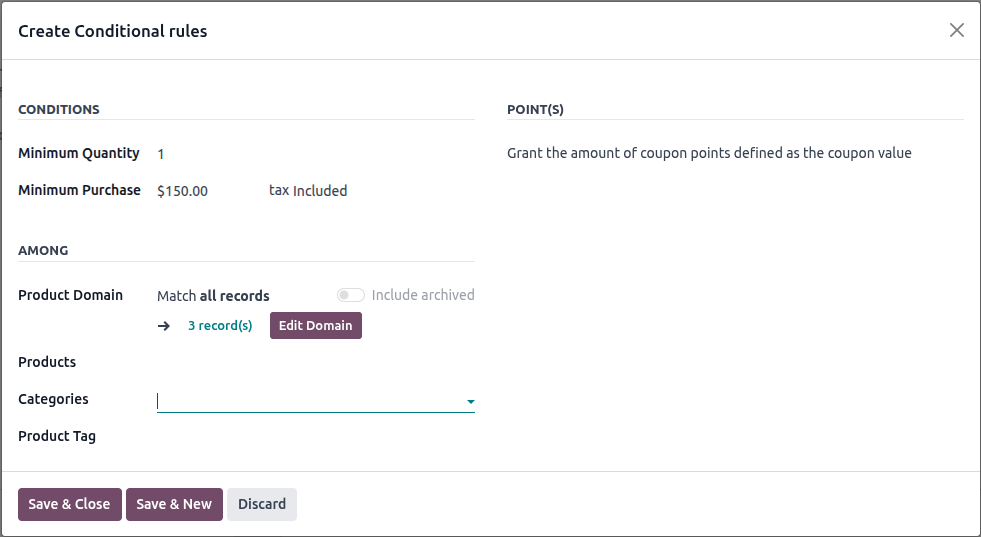 Now we'll be setting the minimum amount condition for the coupon to apply, this is set on "Rules & Rewards"