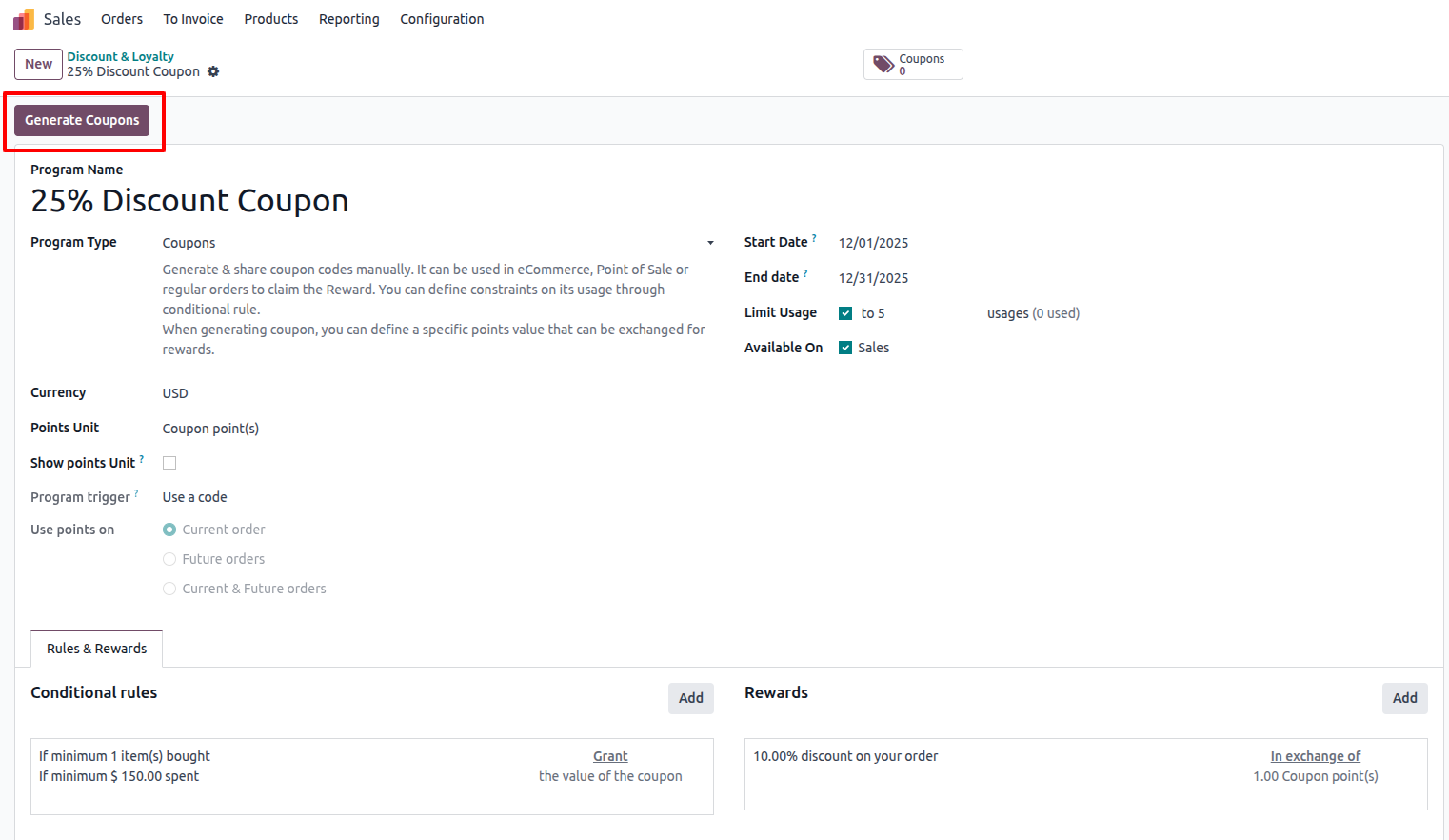 Now that we have set the rules, reward, and other configuration for the coupon, we can start generating the coupon to be used.
