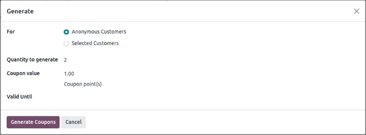 Select the amount of coupon to generate, and set the "Valid Until" date in the case the generated coupon have an expiry date.