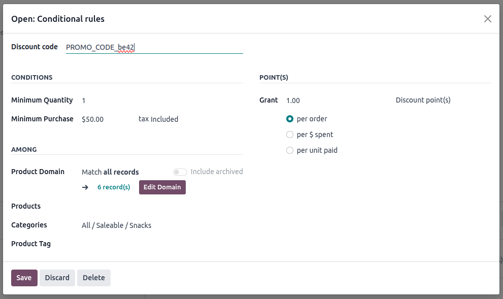- Promotions: Set conditional rules for ordering products, which, when fulfilled, grant access to rewards for the customer.