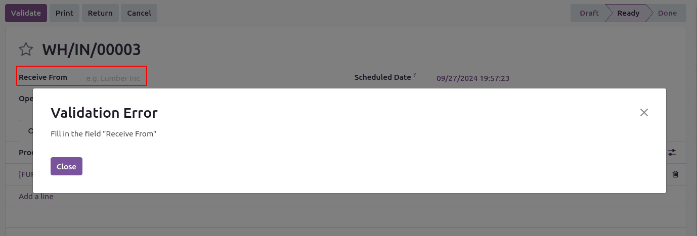 These errors appear as pop-up messages in the Odoo UI. Example: