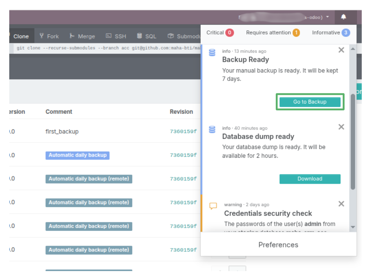 After everything done the new database will shows on the list or there will be notification on the upper right corner that says Backup Ready and you can click Go to Backup.