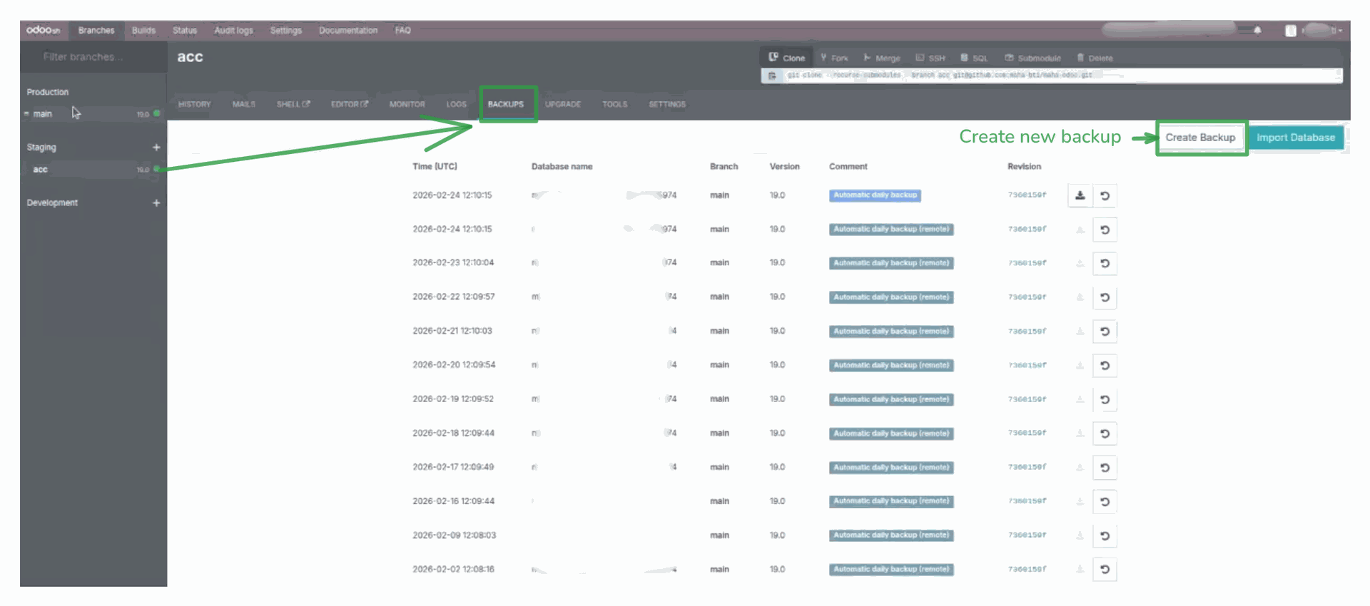 After you click selected the branch navigate to Backups menu, it will shows you the list of backup or listed of daily backup. You can select one of the listed or you can create the new one by clicking "Create Backup".