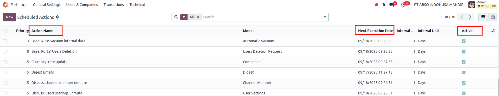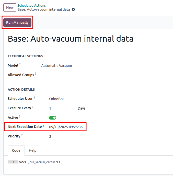 - Execute Code: You can see the actual Python snippet being called. In Odoo 18, this usually looks like model._your_cron_method().