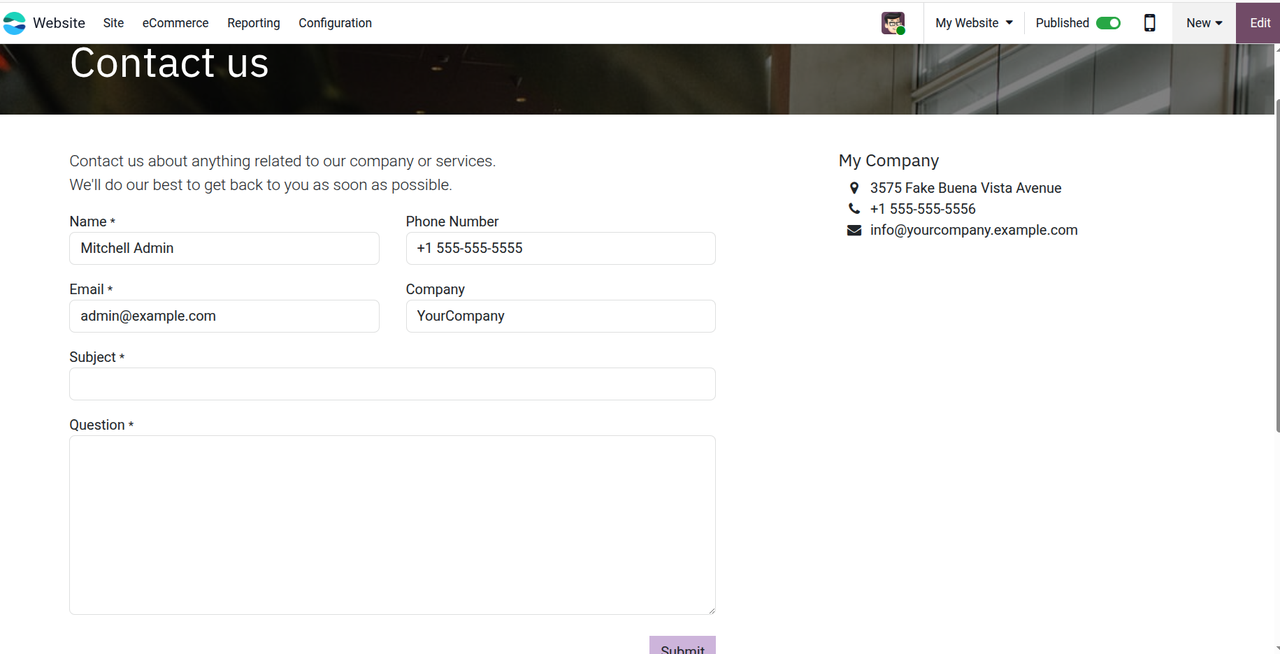 Navigate to your Website → Go to Website in your Odoo dashboard. Then, navigate to your /Contact Us page (or wherever your contact form lives)