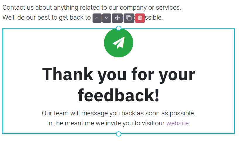 If the form was successfully submitted, you can choose action. Redirect, you can direct the user/customer to another URL. Or Show Message, odoo automatic show this Thank you message like this: