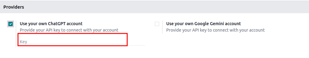 Now that you have your key, you need to connect Odoo to OpenAI.