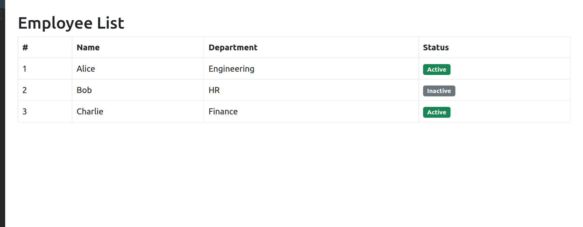 {% for emp in employees %} iterates over every dictionary in the employees list. Each iteration gives you emp, which represents one employee. You access its keys using dot notation — emp.name, emp.department, emp.active.
