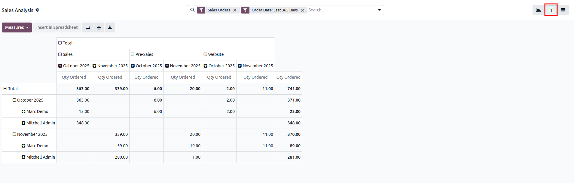 Pivot Tables in Odoo allow users to summarize, analyze, and explore large datasets. The interface is interactive and flexible, giving you the ability to rearrange data, apply filters, and drill down into specific details.