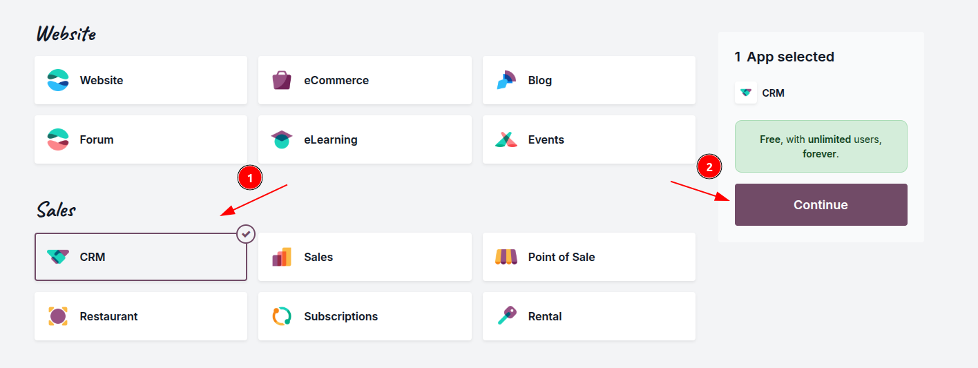 - Select the primary application your business needs right now. For instance, if you want to streamline your sales team, pick "CRM" or "Sales". If you are building an online store, choose "Website" or "eCommerce".