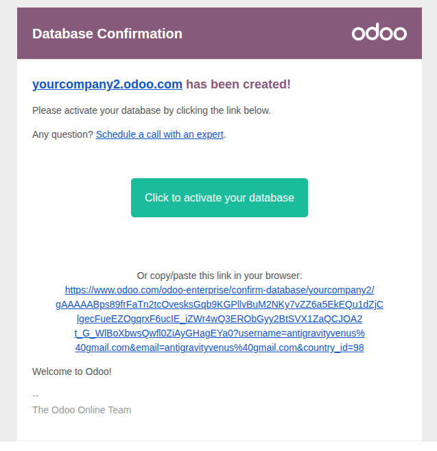 - Look for an email from Odoo with a subject like "Action Required: Activate your database".