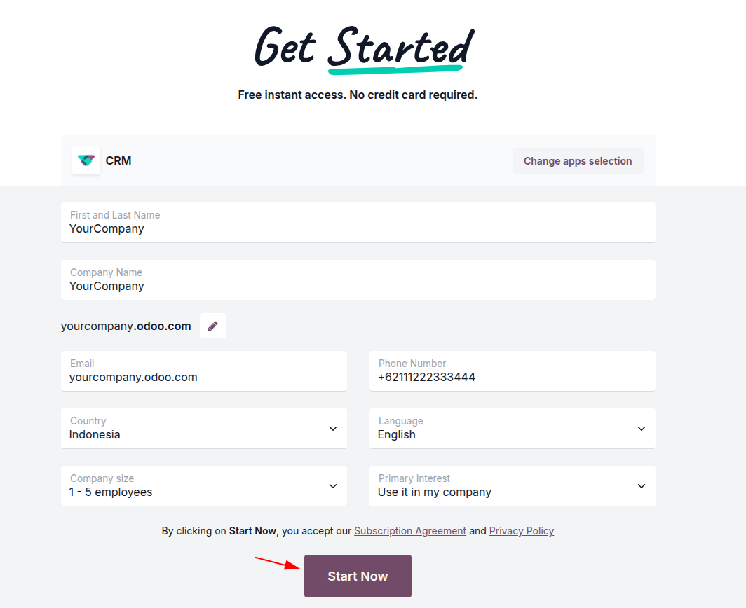 This is the most crucial setup step, where you define your Odoo identity in the cloud. You will be asked to fill out a brief form.
