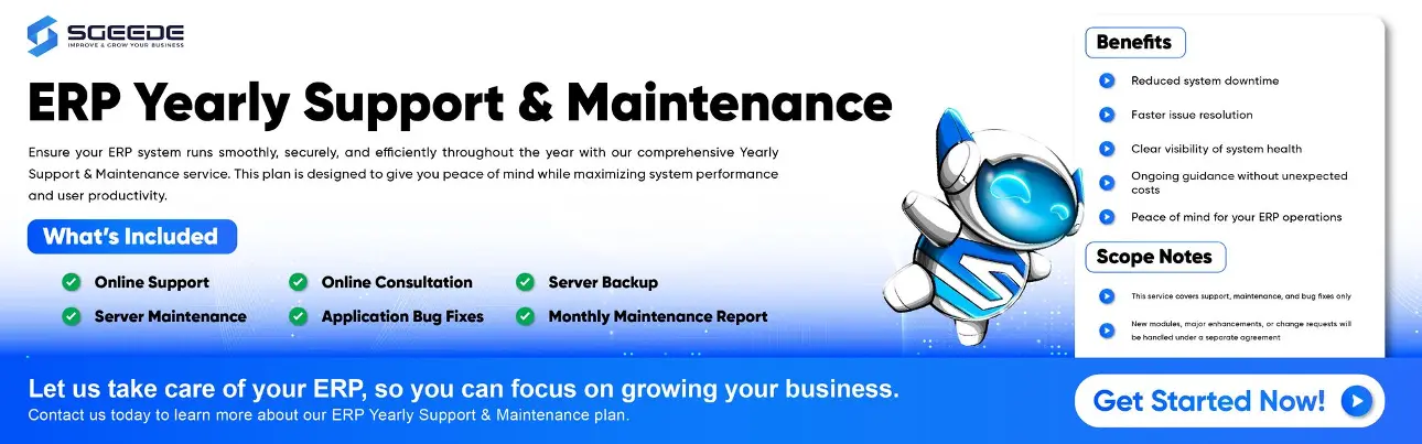 Ensure your ERP system runs smoothly, securely, and efficiently throughout the year with our comprehensive Yearly Support & Maintenance service. This plan is designed to give you peace of mind while maximizing system performance and user productivity.